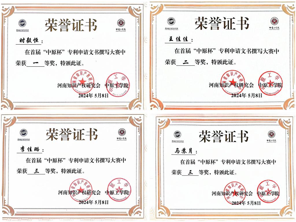 近日,首届“中原杯”专利申请文件撰写大赛在中原工学院龙湖校区圆满落幕。完美官网文法学院知识产权专业时毅恒同学喜获一等奖、王佳佳同学喜获二等奖、马苏月、李佳璐同学喜获三等奖。