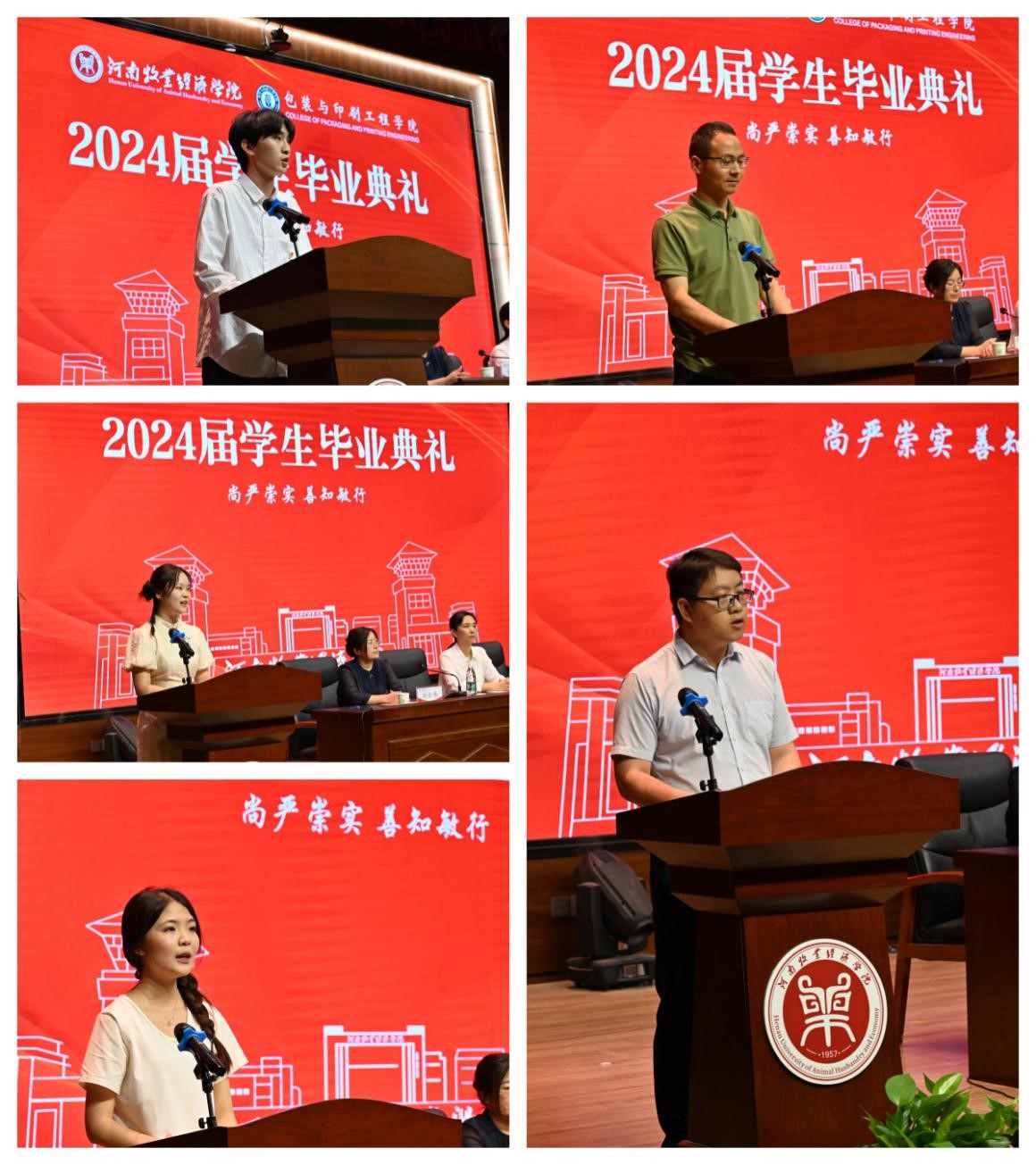 包装与印刷工程学院王建闯博士代表学院全体教师发言,希望所有毕业生志存高远、脚踏实地。包装与印刷工程学院20包装02班的尚昆、20包装02班瞿运草、21包装02班李丹琪分别作为积极就业毕业生、考研升学毕业生代表和在校生代表发言,表达了对学校和老师辛勤培养的感激之情,道出了依依不舍的心声,表示会谨记“尚严崇实 善知敏行”的校训,不断学习,成就理想,为祖国建设贡献青春力量。许昌裕同包装集团资深运营经理韩延辉作为优秀校友代表发言,分享了自己求学和工作的心路历程,表达了对母校的感恩之情和对学弟学妹们的美好祝福。
