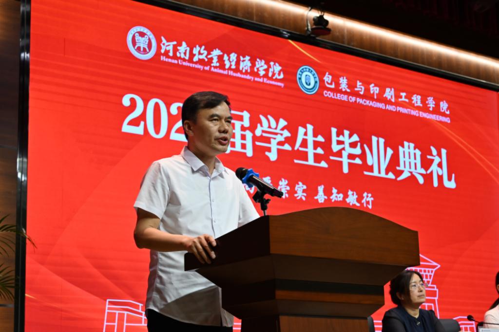 典礼在庄严的国歌声中拉开帷幕。包装与印刷工程学院院长张岩在致辞中深情回顾了与毕业生们共同度过的难忘时光,并对毕业生提出三点希望:一是希望同学们牢记“国之大者”,牢记使命担当,不负青春韶华;二是希望同学们带着“包罗万象、装点未来”的胸怀和“团结和谐、敬业奉献”的包印精神,开启人生新征程;三是希望同学们常回家看看,积极为母校的发展添砖加瓦、献言献策。