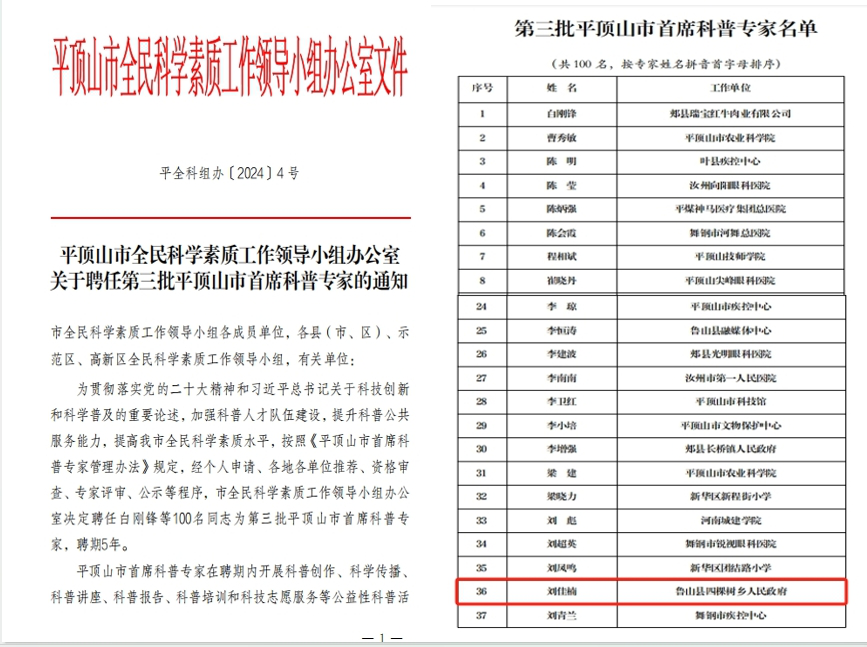 近日,平顶山市全民科学素质工作领导小组办公室公布了第三批平顶山市首席科普专家名单,经鲁山县科学技术协会和鲁山县四棵树乡政府联合推荐,完美官网经济与贸易学院团委书记刘佳楠获聘“平顶山市首席科普专家”。