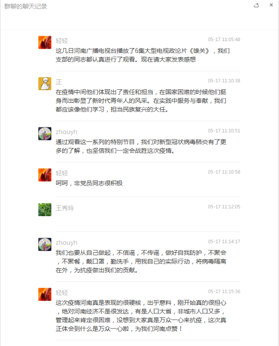 《雄关》的观看与学习,在该院师生中引起了热烈地反响,该院各党支部于16日、17日利用信息技术召开了线上学习研讨会。大家结合自身实际,或通过微信写心得,或通过视频会议谈感受。纷纷表示,该政论片展示了中国战“疫”的河南力量,激昂处热血沸腾,感人处催人泪下。通过交流,大家更深刻认识到了中国共产党领导和我国社会主义制度、国家治理体系强大生命力和显著优越性,更坚定了在平凡的工作岗位上用实际行动彰显责任与担当的勇气与信念。 (信息工程学院 李井竹/文 各党支部/图)