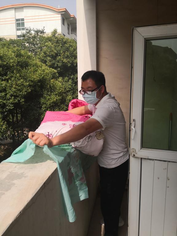 该院辅导员深入宿舍,打开一扇扇窗户,通风的同时将一床又一床已经久未见阳的被褥放置太阳下晾晒、消毒、翻晒。院团委书记詹珅说:“我作为一名教师,帮助学生晾晒被子、清理宿舍、打扫校园,就是盼望学生们早日回到“家园”。