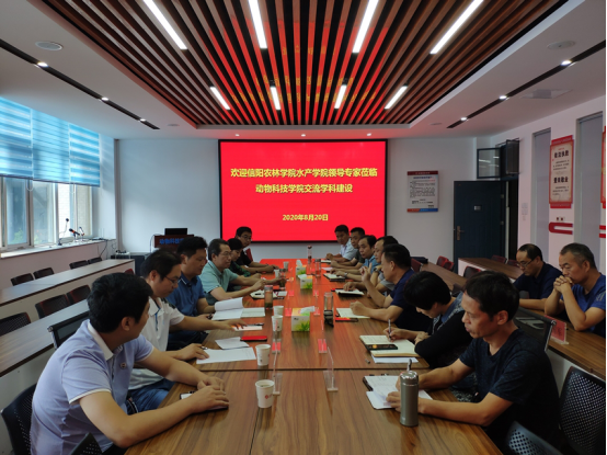 8月21日,信阳农林学院水产学院书记郭旭升、院长杨东辉一行6人到完美官网动物科技学院考察交流本科合格评估和水产专业发展建设等工作。动物科技学院党委书记王建伟、院长席磊、副院长牛辉和水产养殖教研室全体老师参加了交流座谈。