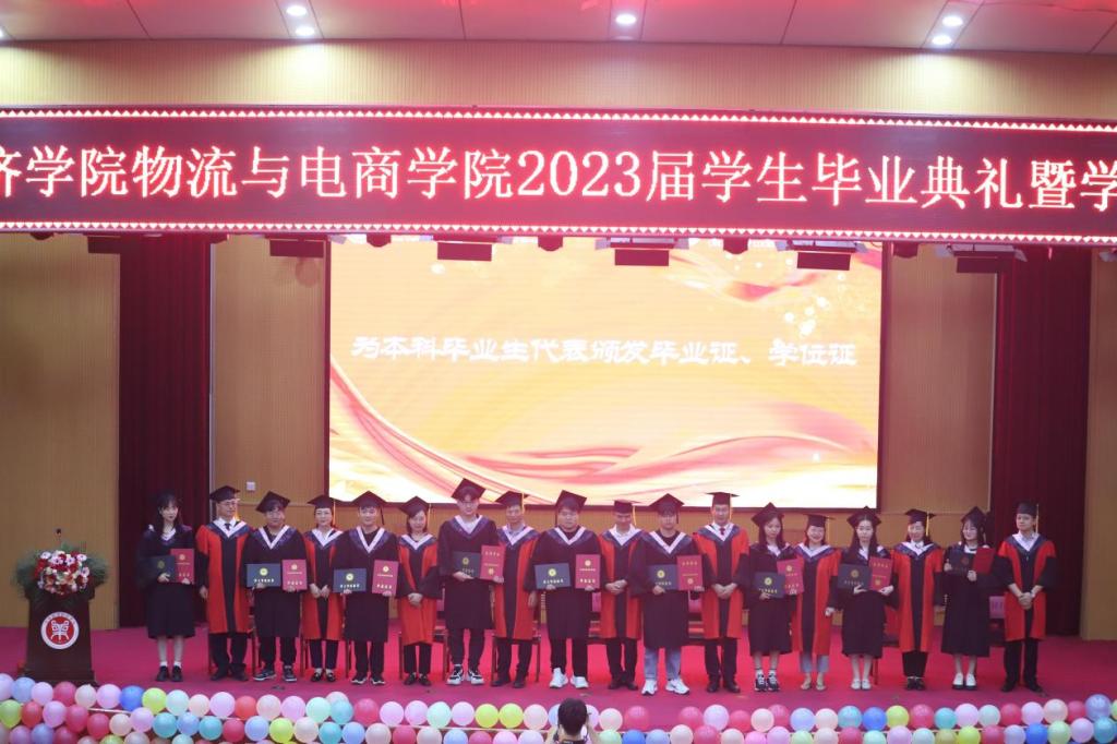 毕业典礼暨学位授予仪式在庄严的国歌声中拉开序幕。物流与电商学院党委书记于晓胜、副院长李艳菊分别宣读了《关于表彰物流与电商学院2023届优秀毕业生的决定》《关于授予物流与电商学院2023届本科毕业生学士学位的决定》,与会校领导为优秀毕业生颁发荣誉证书,为毕业生代表颁发毕业证、学位证并拨正流苏。