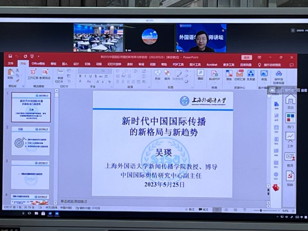吴瑛教授在讲座中分析了国际传播新格局和新趋势,凭借多年丰富的学术经验,结合生动的研究案例和研究成果,与大家分享了其团队在加强中国国际传播能力方面所提出的理论与实践的思考。同时,吴瑛教授鼓励外语学院的老师们尝试跨学科研究,充分发挥自身语言优势,挖掘外语学科潜力,推动外语学科与新闻传播学科的交叉融合发展,拓展外语学科的发展空间,大力推进新文科建设和外语学科转型发展。学术讲座后,吴瑛教授和与会教师进行了线上互动,悉心解答老师们提出各种问题,并对部分老师的研究选题进行了点评,提出了针对性建议。